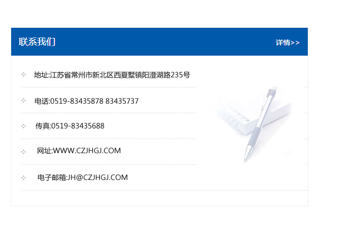 地址:常州市新北區友邦商務大廈1幢16、17層  電話:0519-85101652  傳真:0519-85112595  郵編:213022  網址:www_cz-jiayue_cn.edqcc.com  郵箱:xiajifengaa@163.com
